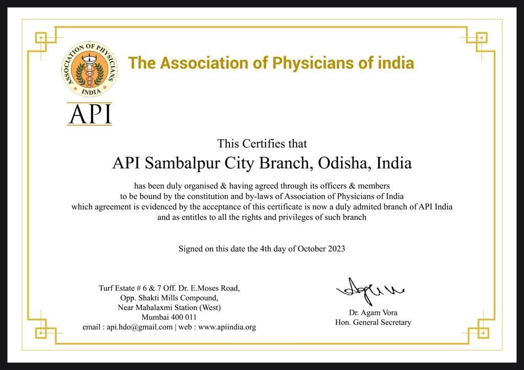 Greetings from the API Sambalpur City Branch! As the new Honorary Secretary, I am honored to carry on the outstanding work of our previous team, which included Dr. Ashok Singh, our founder chairman, Dr. Sagnika Tripathy, our immediate past chairman, and Honorary Secretary Dr. Atanu Thakur.I want to carry on the tradition of scholarship and fellowship to a new degree under the direction of our new chairman, Dr. Alekh Pr. Mohapatra.I’m excited to collaborate with each of you.